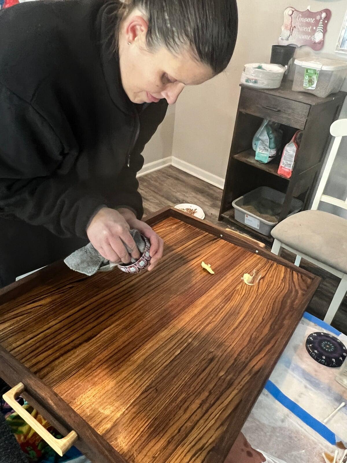 Every custom order is finished by hand, one step at a time. Here, Lexie hand-buffs the final surface, bringing out the natural depth of the wood and ensuring a smooth, durable finish that feels as good as it looks. It’s a quiet part of the process, but an important one — where details are checked, edges are softened, and the piece is made ready for real use.