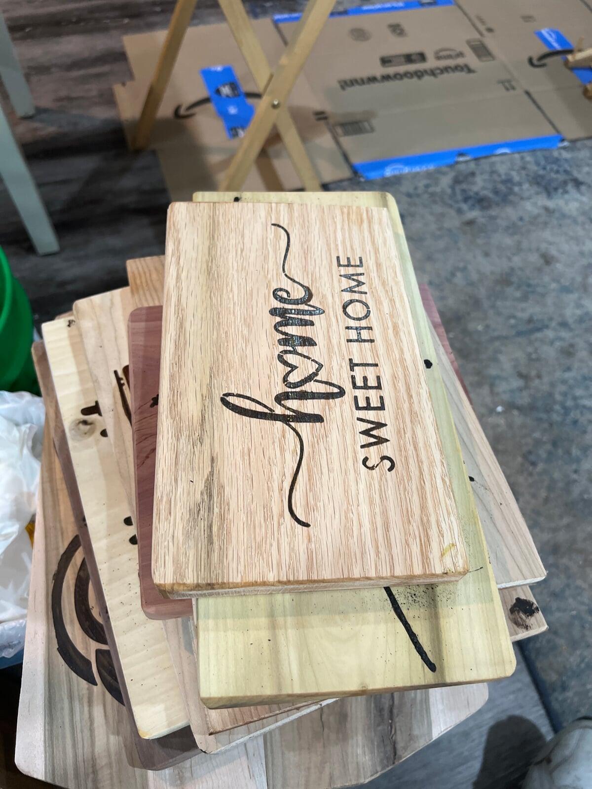 Custom stenciling can be paired with a variety of hardwoods and formats, from kitchen-ready boards to decorative pieces meant for display. If you’re unsure what will work best for your idea or intended use, we’re happy to talk it through and help guide the design.